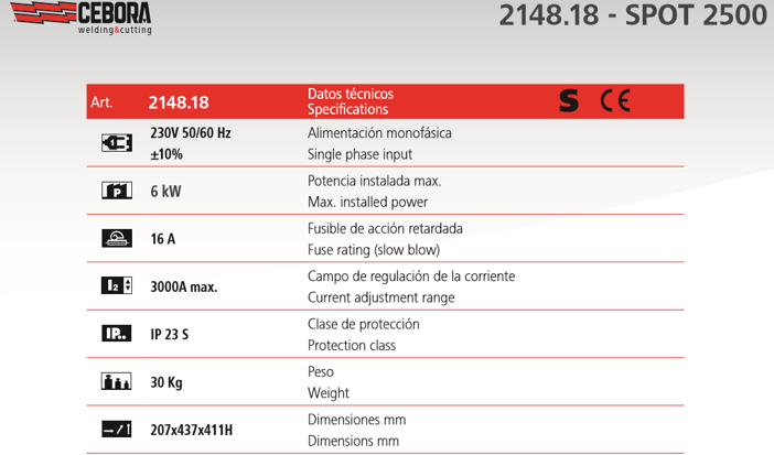 Cebora propone al sector de las carrocerías de automóviles el nuevo generador multifunción de regulación electrónica, control síncrono y tablero digital Spot 2500 (art. 2148.18), ideal para las intervenciones de reparación en carrocerías de chapas convencionales a excepción del aluminio.